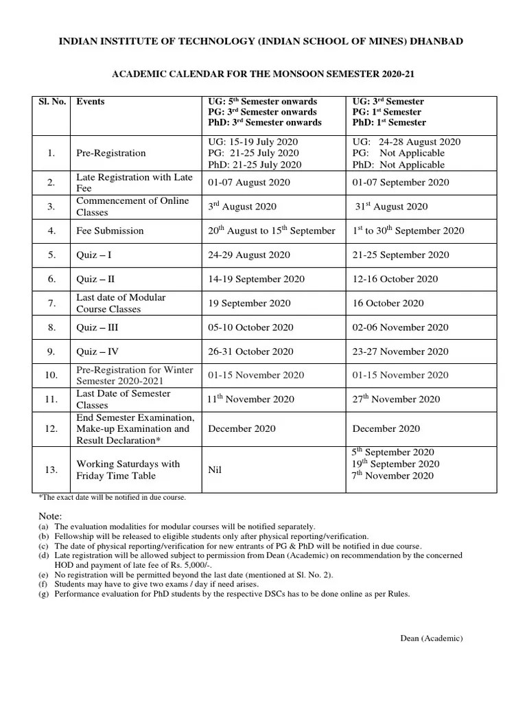 Academic Calendar for the Monsoon Semester 202021 at the Indian