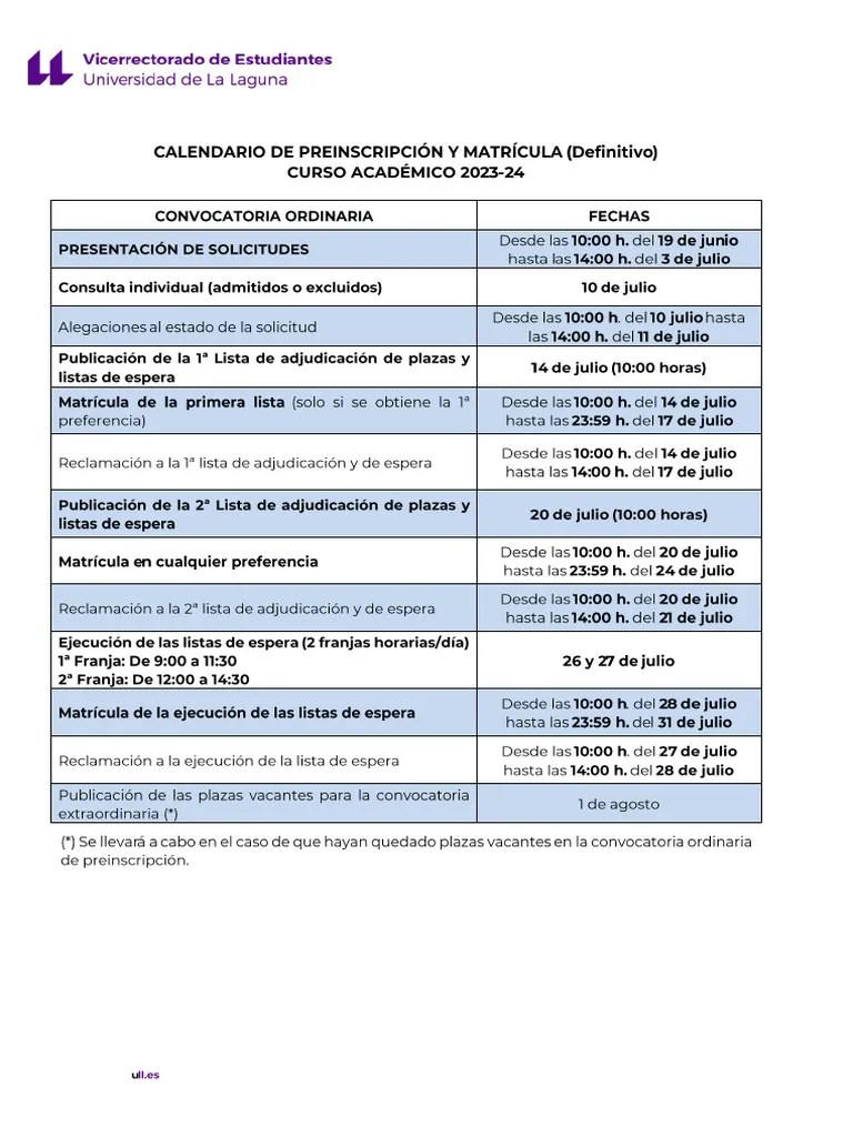 Calendario Preinscripción y Matricula ULL PDF