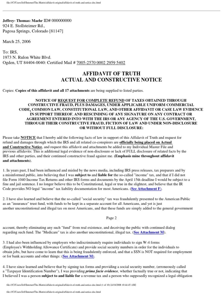 AFFIDAVIT OF TRUTH ACTUAL AND CONSTRUCTIVE NOTICE,Jeffrey Thomas Maehr