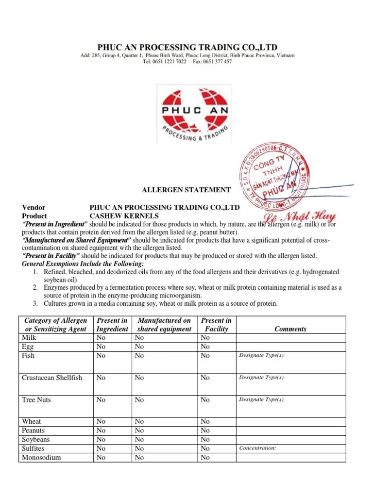 Template QA.02.c.001.Allergen Statement PDF Allergen Food Ingredients
