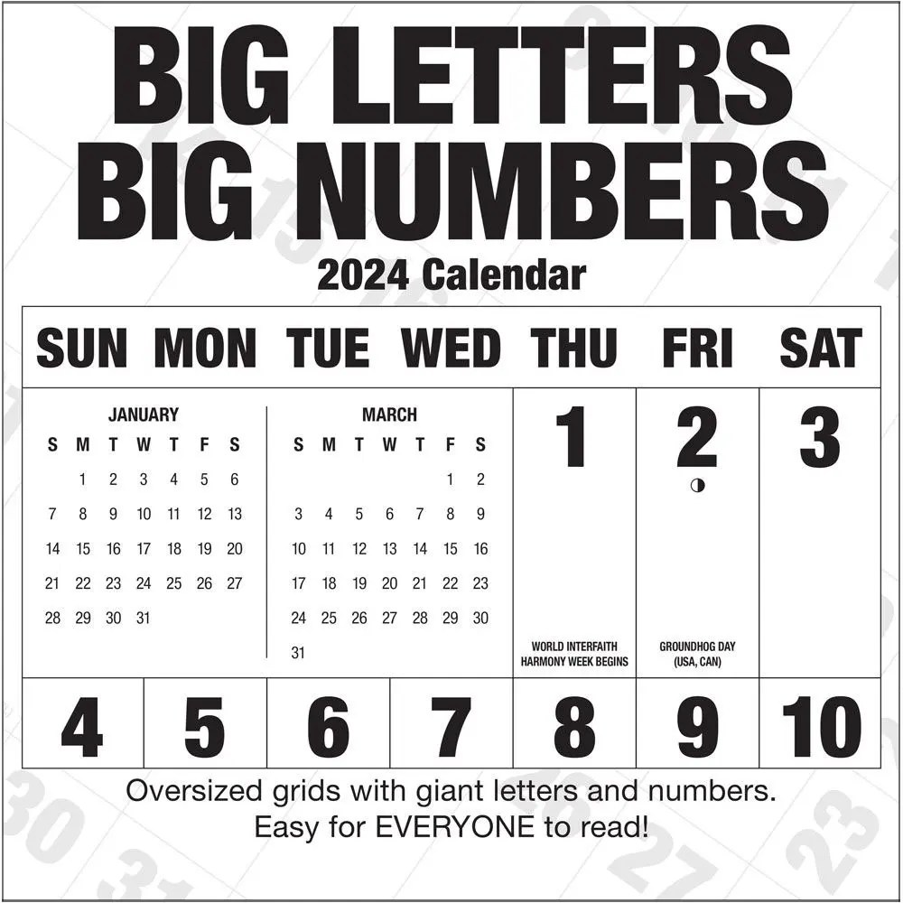 Shop our mid sized big number calendar for easy visibility to stay on track. This calendar contains all 12 months, january through december. They will have big letters and big numbers with plenty of room to write all your. A large print calendar is great thing to have if you are visually impaired or you just want to see them.