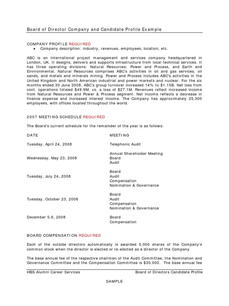 Candidate Profile Example Board Of Directors Chief Executive Officer