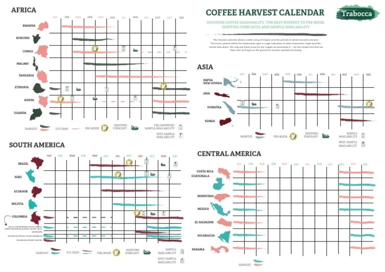 This document shows a coffee harvest calendar for different regions around the world. Download this coffee calendar here and know when to order and roast your coffee. In some regions the coffee harvest may occur more than once a year, or even require picking of coffee cherries through large parts of the year. Harvest periods may vary by region within.