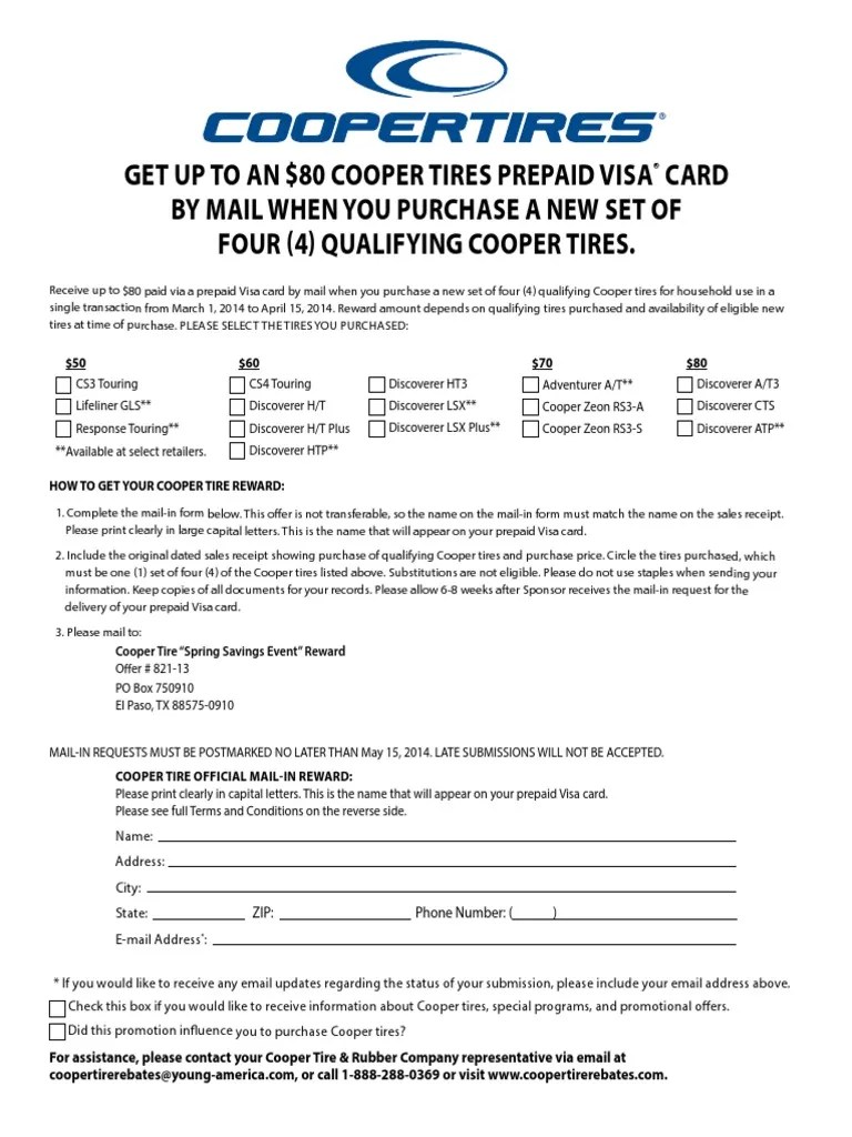 After purchasing, you will receive a rebate form via email or you can download the rebate form. Either mail in your rebate with a copy of your invoice/receipt along with the fully completed rebate form, or submit your rebate directly at. Looking to redeem your cooper rebate? Download and print the rebate form for buying a set of 4 qualifying.