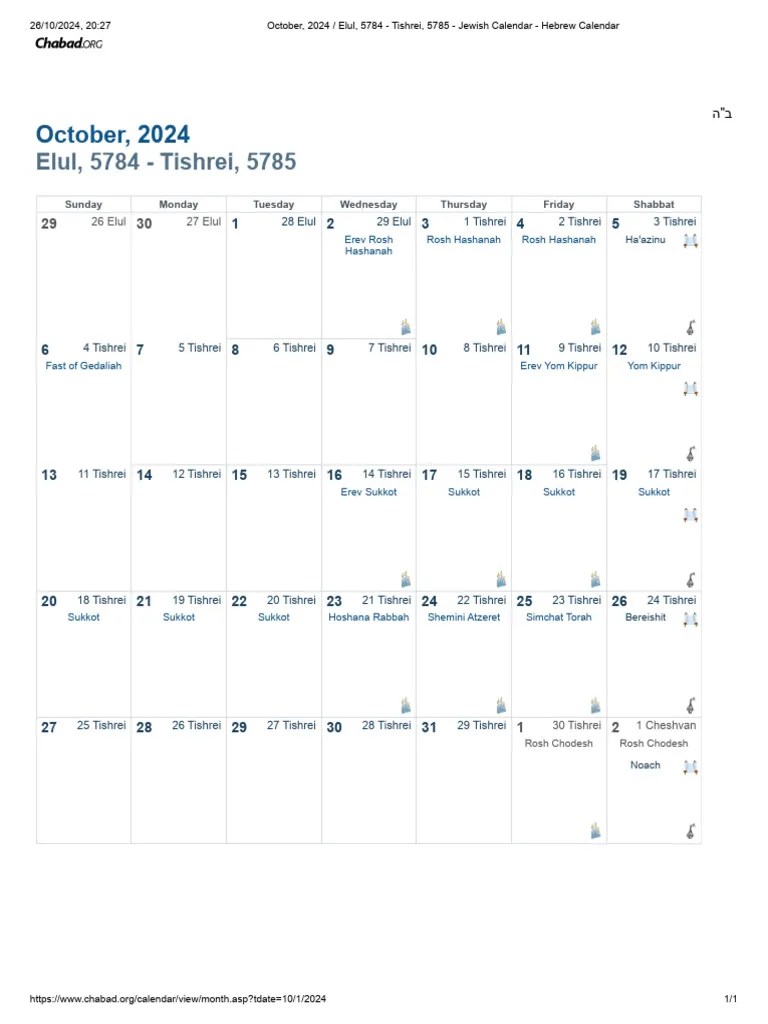 October, 2024 Elul, 5784 Tishrei, 5785 Jewish Calendar Hebrew