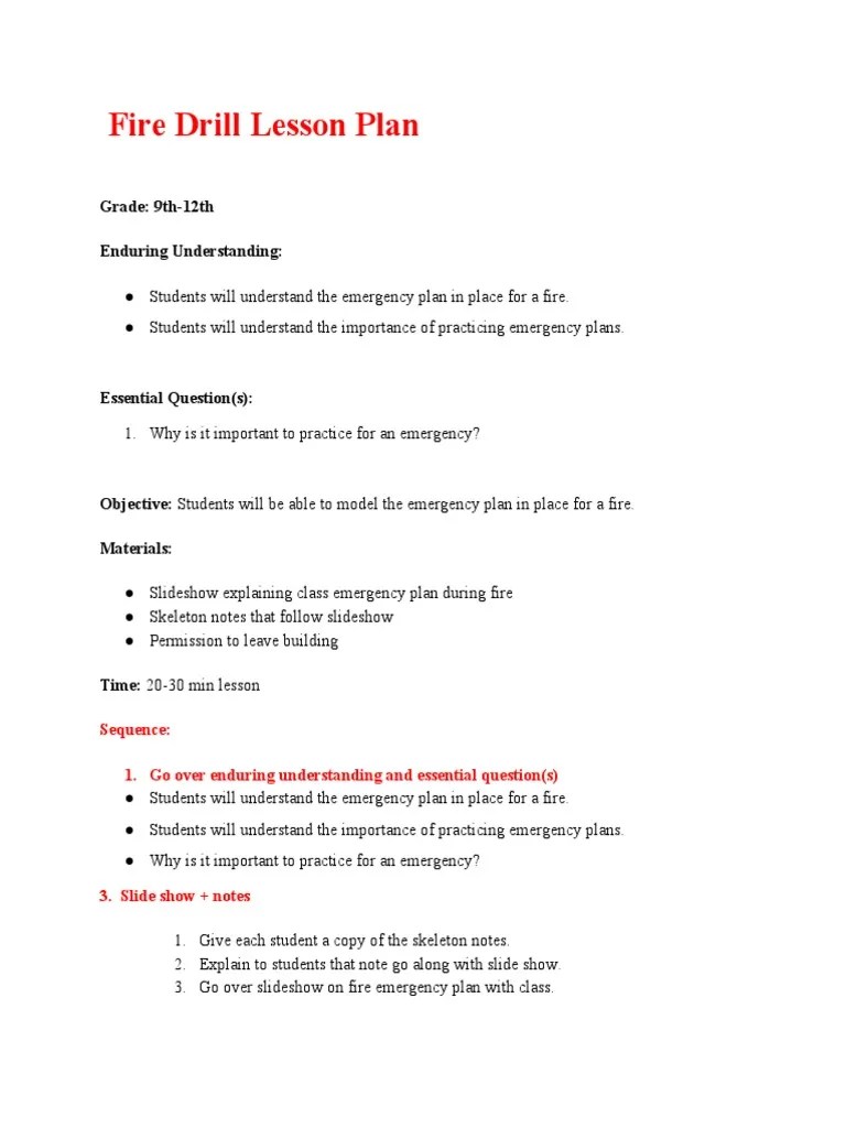 Fire Drill Lesson Plan Grade 9th12th Enduring Understanding PDF