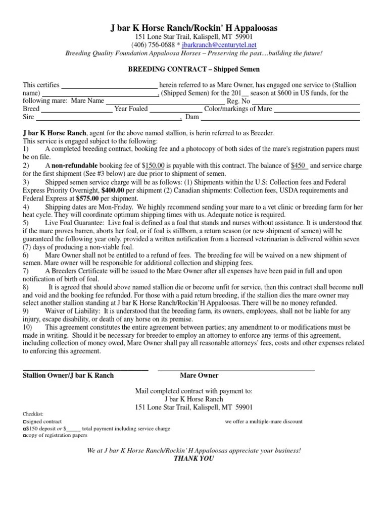 Breeding Contract (Shipped Semen)PDF Horse Breeding Mare