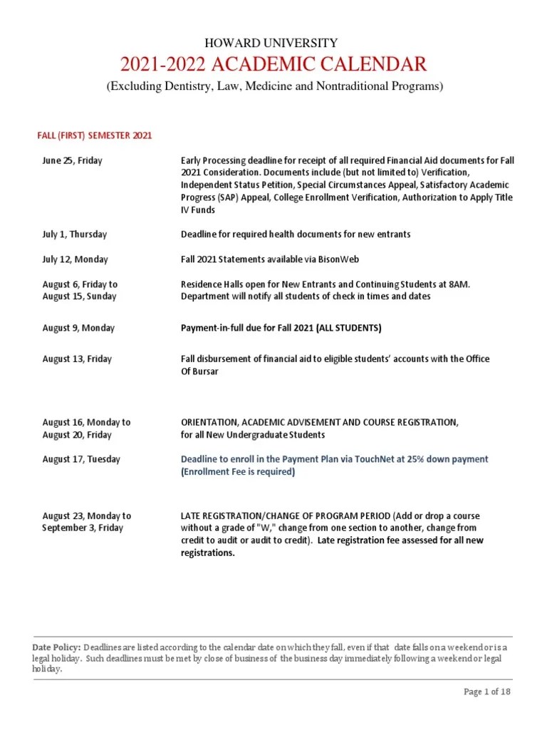 20212022 ACADEMIC CALENDAR Howard University PDF Workweek And