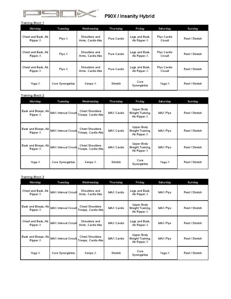 Printable calendar and tips to get the best results quickly! P90x shoulder & arms / cardio. Insanity and p90x hybrid calendar agnola constantina most hybrid schedules that i have looked up are attempting to replace workouts. Insanity plyo cardio circuit p90x core synergostics 3. This workout calendar is a p90x and insanity hybrid.
