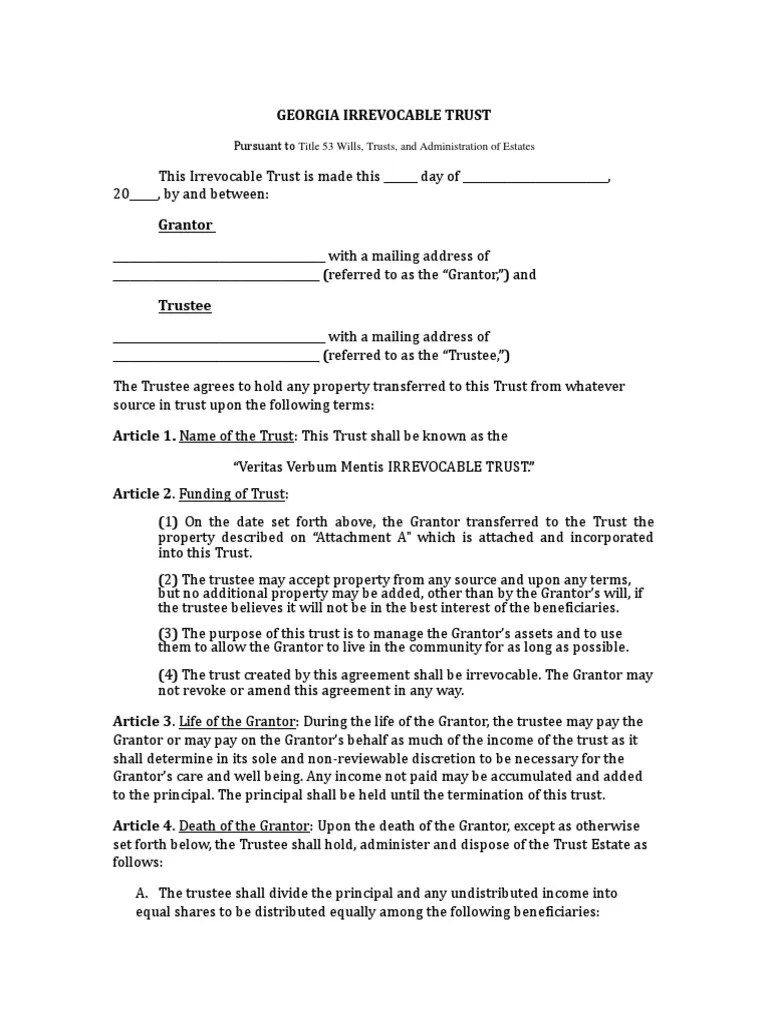 Georgia irrevocable living trust form download this georgia irrevocable living trust form in order to set aside certain property and assets of your. Georgia general form of irrevocable trust agreement. Establishing and managing irrevocable trusts in georgia. Us legal forms provides access to the largest library of fillable templates in word. Learn about the creation, management, and benefits of.