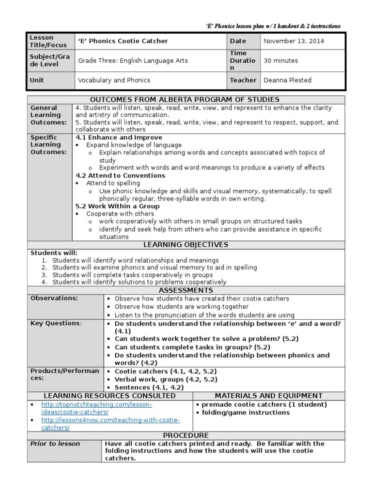 Sample Lesson Plan 1 Phonics Lesson Plan