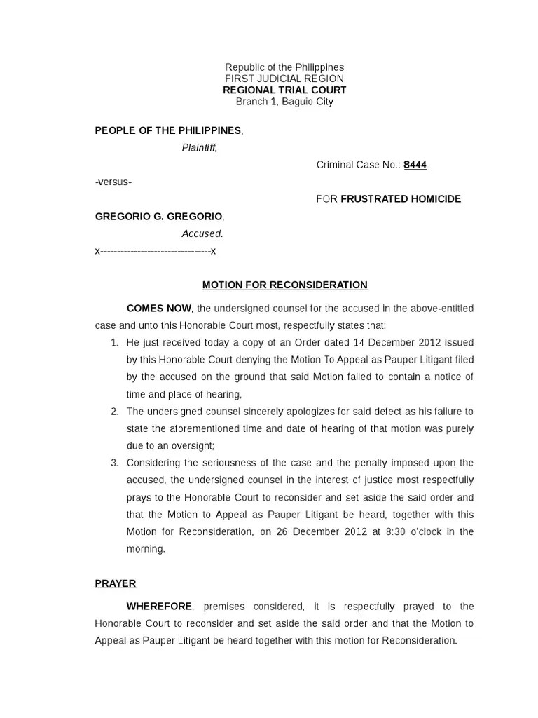 Sign, print, and download this pdf at printfriendly. View the sample motion for reconsideration document in our collection of pdfs. Motion for reconsideration comes now the complainant by the undersigned attorney and within the reglementary period prescribed by. Easily create and customize your legal documents. Before the first monday in december.