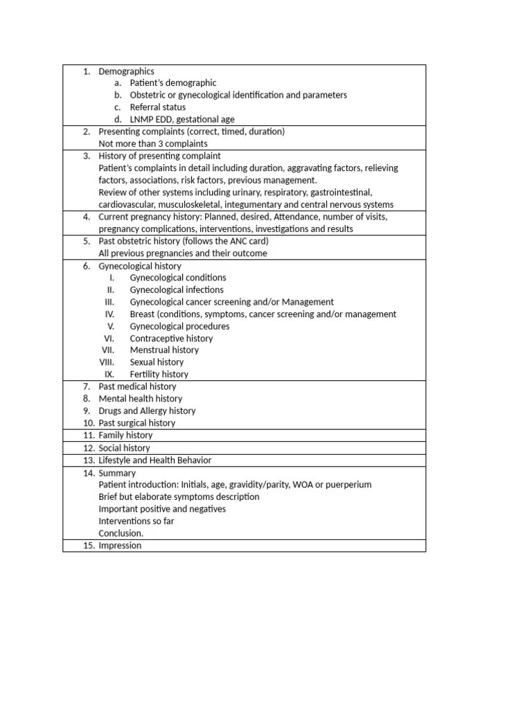 ( please check all that apply and indicate which family member/side of family): From past obstetrical/gynecological surgeries and gynecological history to pregnancies and. The document outlines a comprehensive patient assessment framework focusing on demographics, presenting complaints, medical history, and current pregnancy details. If so, what was the diagnosis and when? Begin by gathering all relevant information about the patient's obstetric.