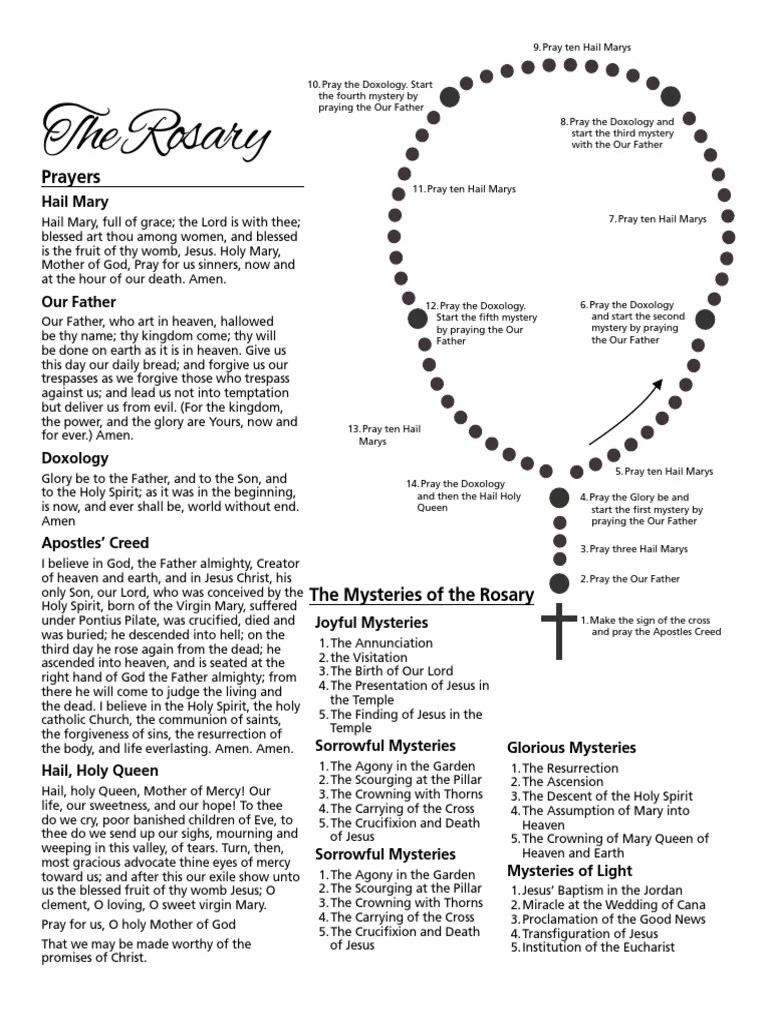 The first is an 8.5 x 11″ guide with all the prayers and mysteries of the rosary (including the st. A pdf document that explains the prayers, mysteries, and steps of the holy rosary, a devotion to the blessed virgin mary. Michael prayer and the sub tuum). Each decade of the rosary includes.