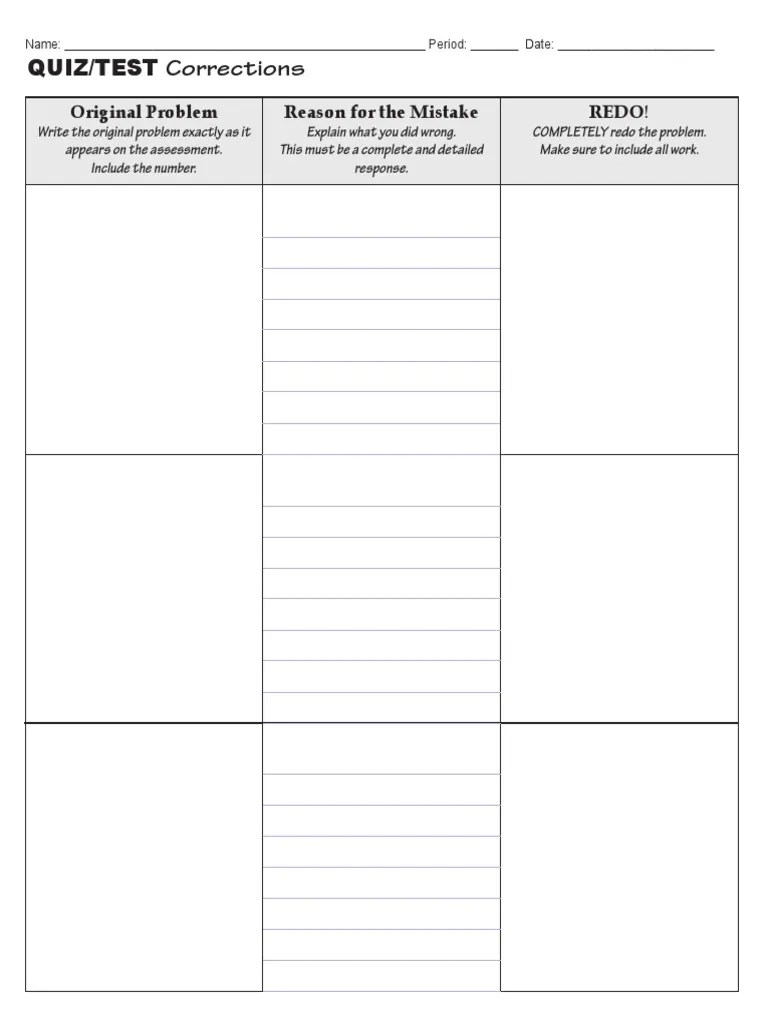 Each row must be filled in completely for every question. My students are provided the opportunity to receive half credit back for every complete test correction. It can help pinpoint study habits that may need. Quiz corrections template this document is a form for students to request corrections on quiz or test problems. View, download and print test corrections and.