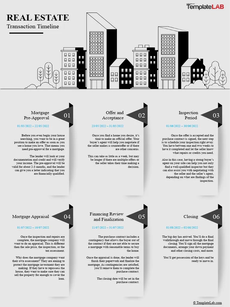 Edit, sign, and share real estate transaction timeline template online. Clickup’s timeline template for real estate agents and brokers is designed to streamline the buying and selling process of properties,. Learn how to manage a real estate transaction from contract to closing with flow charts, checklists, definitions and more. At the end of this guide, we’ll also share a free.