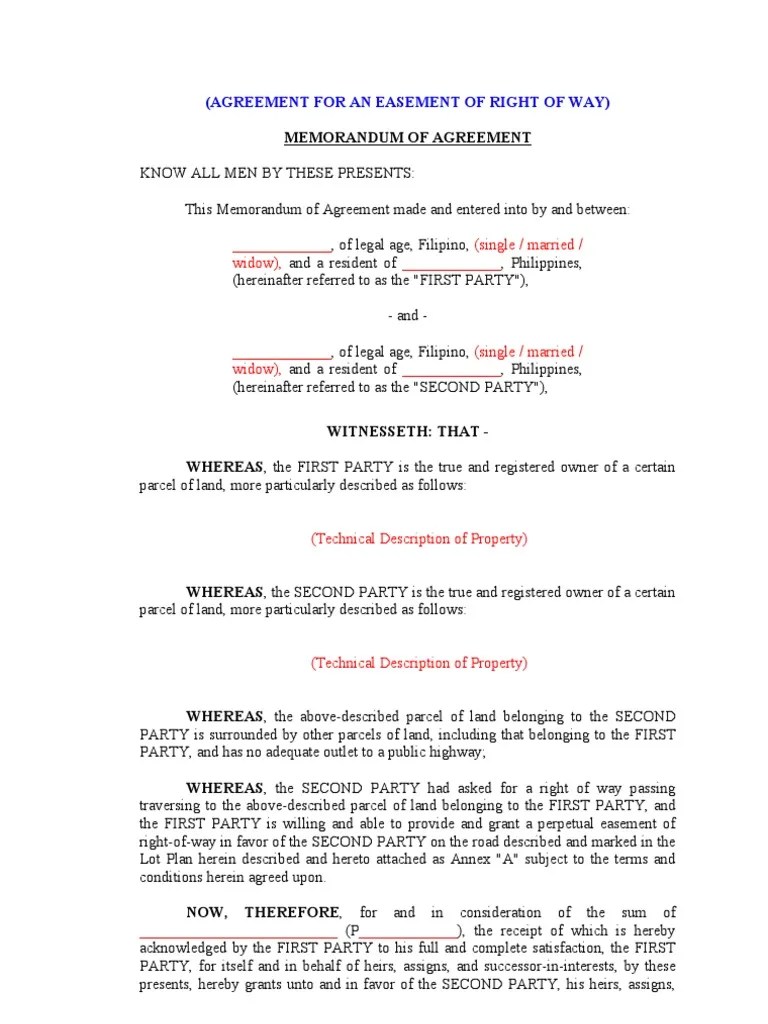 The document is a memorandum of agreement. Edit, sign, and share right way agreement sample online. Right after completion, you can easily send the right of way agreement to the appropriate individual, or multiple recipients via email or. Each party covenants that it has and will continue to have throughout the term of this agreement and any extensions thereof, the full right to enter.