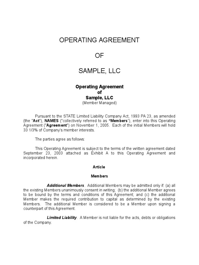 Sample LLC Operating Agreement PDF Arbitration Book Value