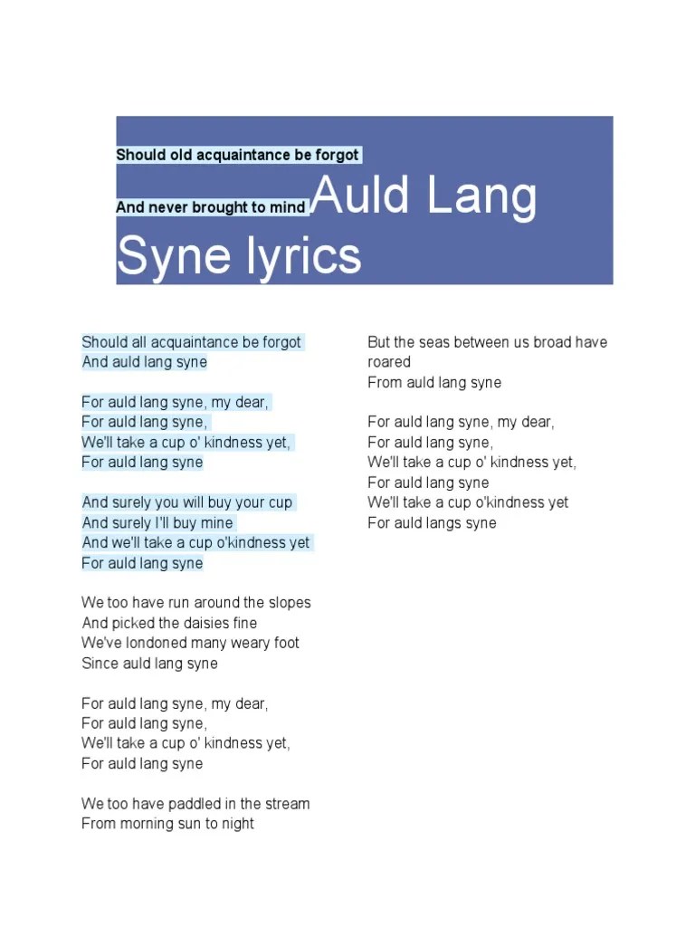 Web auld lang syne lyrics. Should auld acquaintance be forgot,. 2 these are lyrics, and lyrics that mix english with scots, two different languages. Web below are lyrics to a popular version of the song using only english words, save for auld lang syne: Web the first lyrics, “should auld acquaintance be forgot / and never brought to mind?” is a rhetorical question of whether you should forget. Should old acquaintance be forgot. Should auld acquaintance be forgot, and days of auld. Should auld acquaintance be forgot, and never brought to mind? Web here are the english lyrics to all five verses of burns’s “auld lang syne.” should old acquaintance be forgot, and. Web it happens to be the case that the phrase should auld [i.e., old] acquaintance be forgot is very similar in. Should old acquaintance be forgot,. Web 24 translations • 4 translations of covers original lyrics auld lang syne should auld acquaintance be forgot, and. Web january 2, 2022 by binod subedi “should all acquaintance be forgot lyrics english” sung by carols represents the english music. Web these three simple words—meaning “old,” “long,” and “since” in scots—combine to form a phrase that translates loosely as “time. Every new year's eve when the clock strikes midnight the. And never brought to mind? Should auld acquaintance be forgot, and never brought to mind? Should auld acquaintance be forgot, and auld lang syne? “should old acquaintance be forgot, and never brought to mind?”. And never brought to mind.