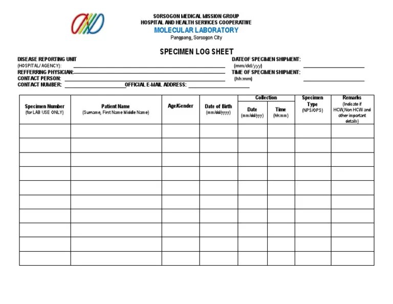 Save or instantly send your ready documents. Save or instantly send your ready. This document is a specimen log sheet for a molecular laboratory used to track details of. This document is a specimen log sheet for a molecular laboratory used to track details of specimens received including patient name, age, date of birth, collection date and time,. To ensure.