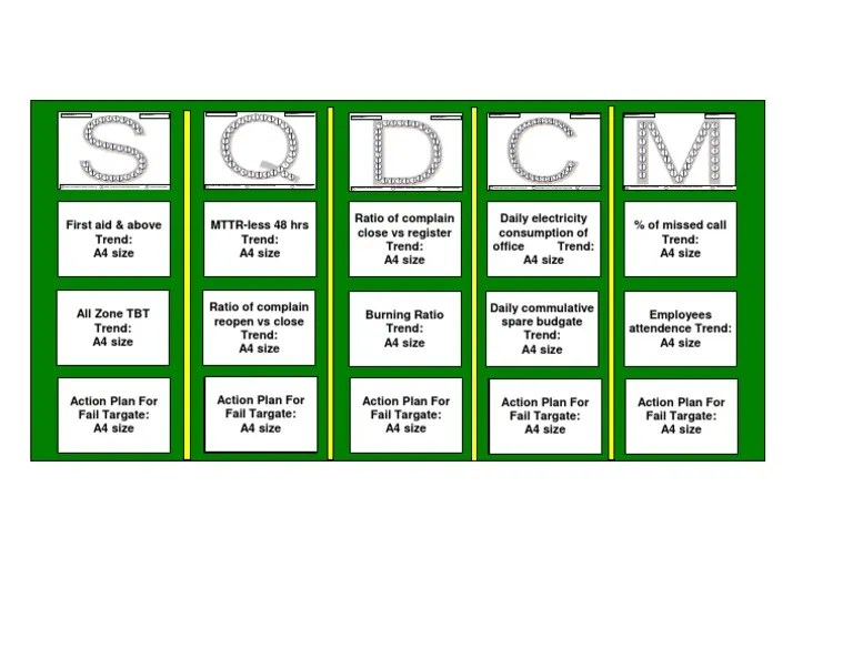 They stand for the key performance indicator categories of. Web the giant letters sqdcm are common sights on visual display boards of teams on the gemba. Refers to a sqdc board placed in a process area, to quickly convey how the process is performing. Web an sqdcm board is a bulletin board hung in a process or production area which.