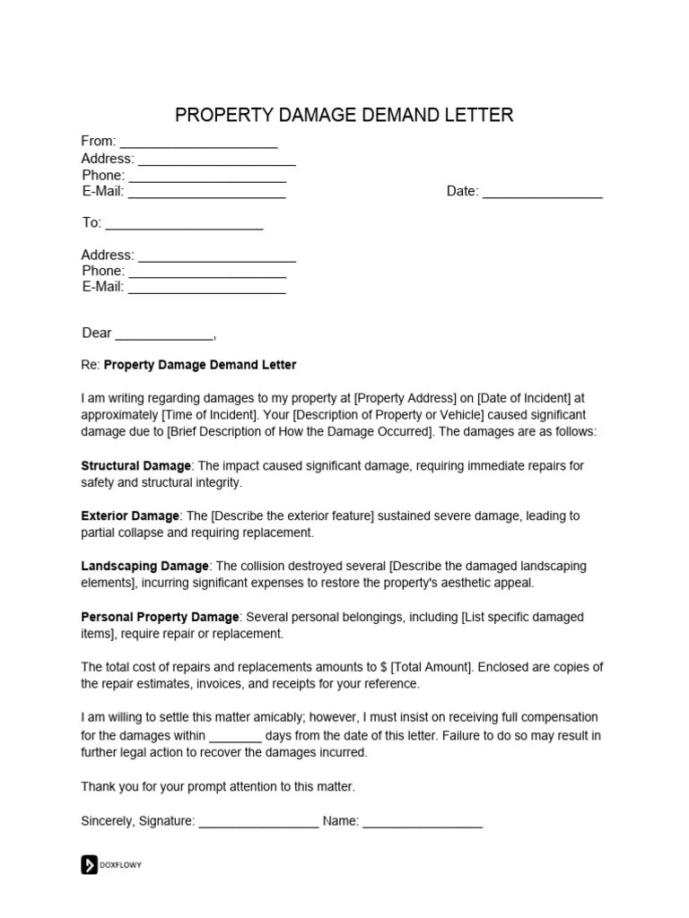 Whether you're dealing with property damage in a rented space, a damaged product purchase, an insurance claim, or issues arising from a. An effective way to see if the person who damaged your property will pay for repairs or a replacement of the property is to send a demand letter for property damage. Create a professional property damage demand letter.
